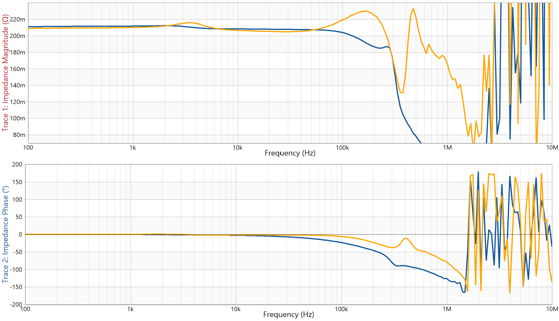 Overall, both sensors show stable impedance behavior up to approximately 100 kHz, matching the expected impedance values (~210 mΩ).