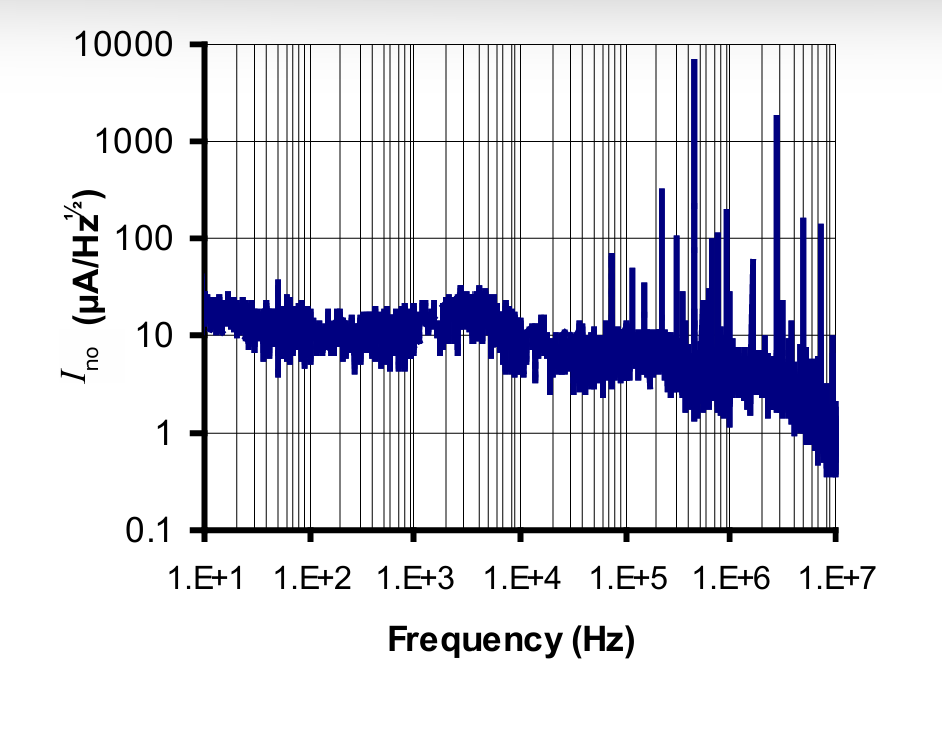Fig. 294 Input noise spectrum of LEM CASR sensor (from datasheet). Strong excitation harmonic appears at ~435 kHz with visible odd harmonics.#