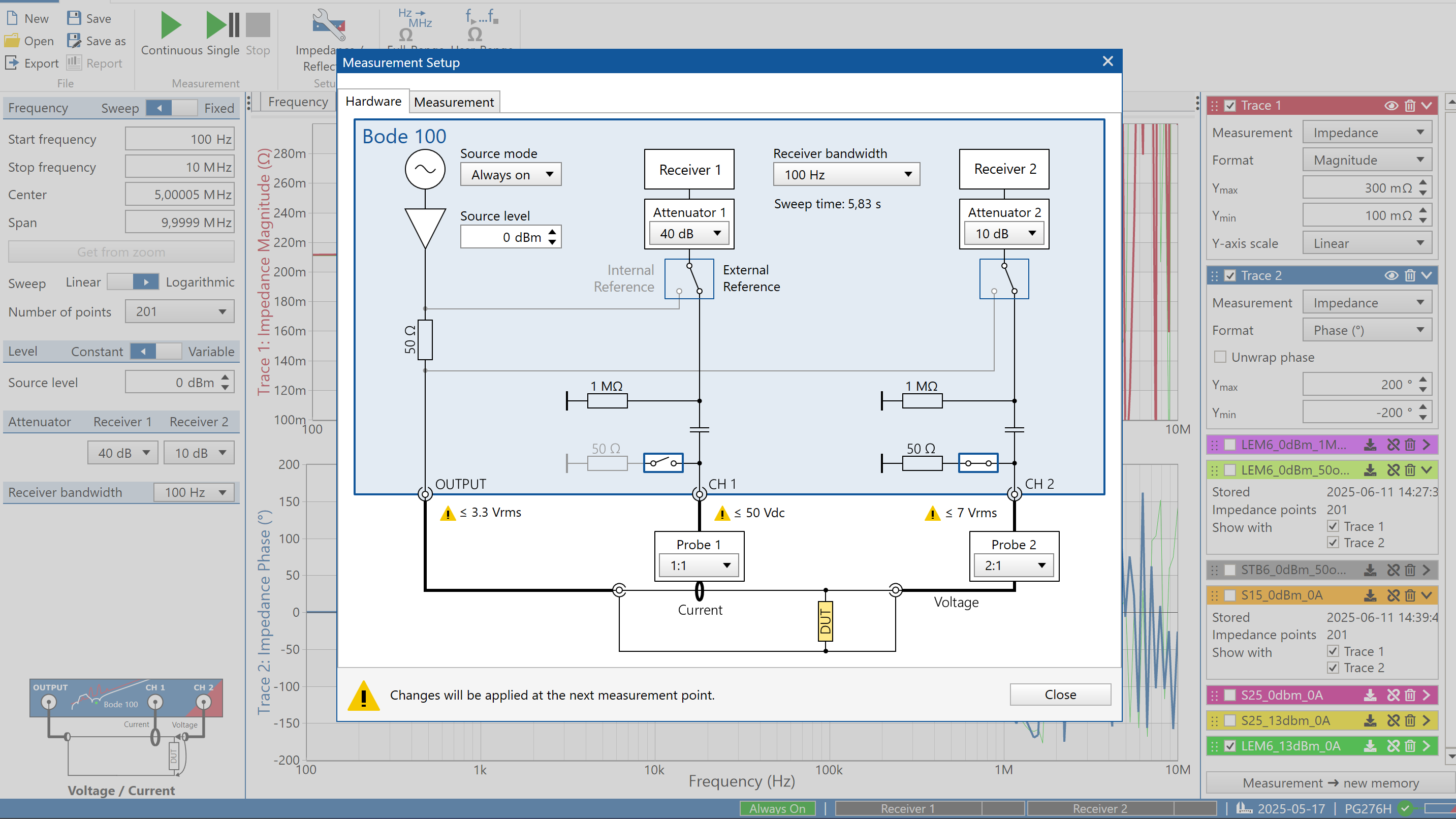 Bode 100 computes gain \(G = \frac{V_{\text{CH2}}}{V_{\text{CH1}}}\) and converts to impedance.
