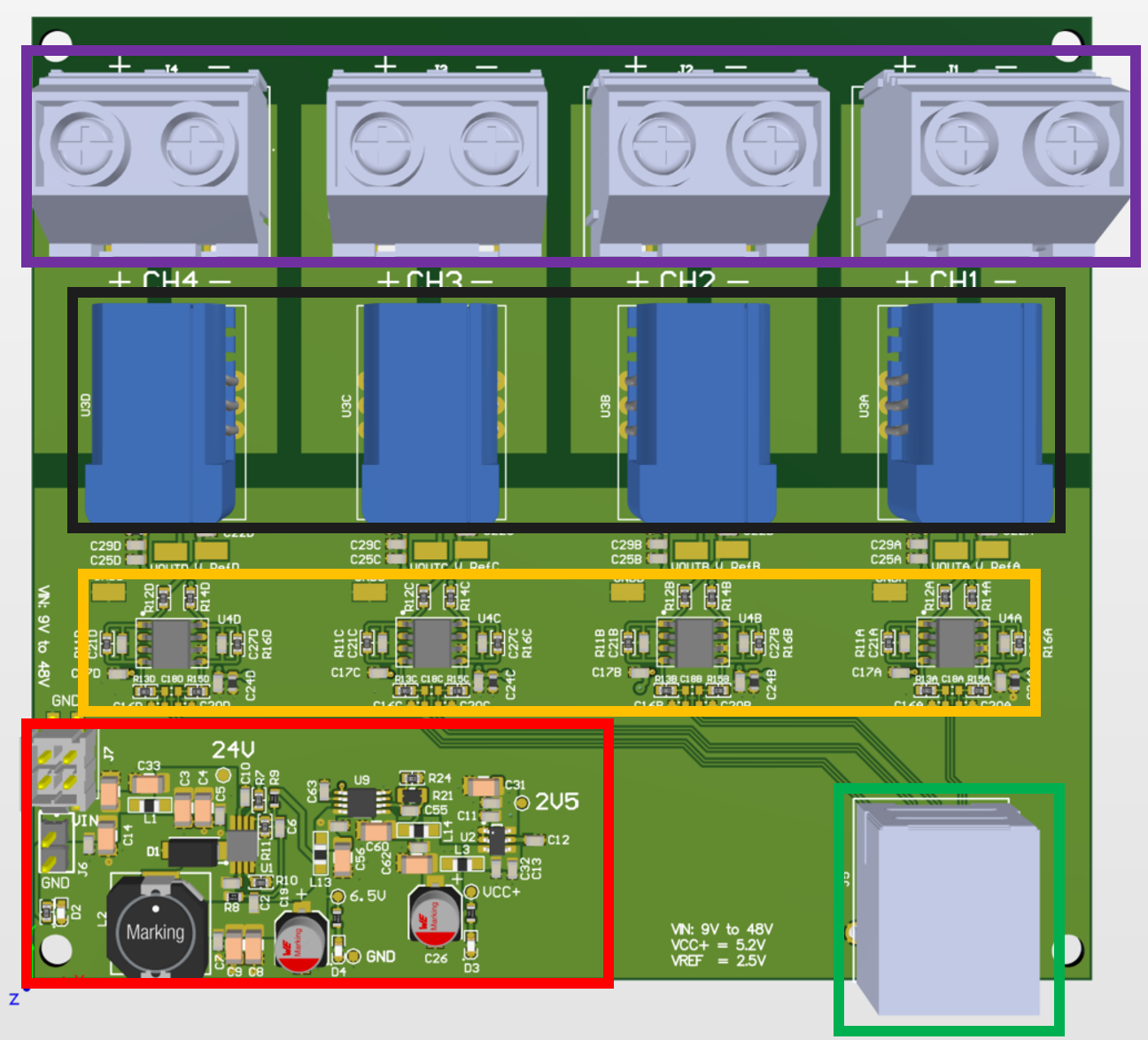 🟥 Red: Power supply section with DC/DC converter (24 V to 5.12 V) and 2.5 V reference