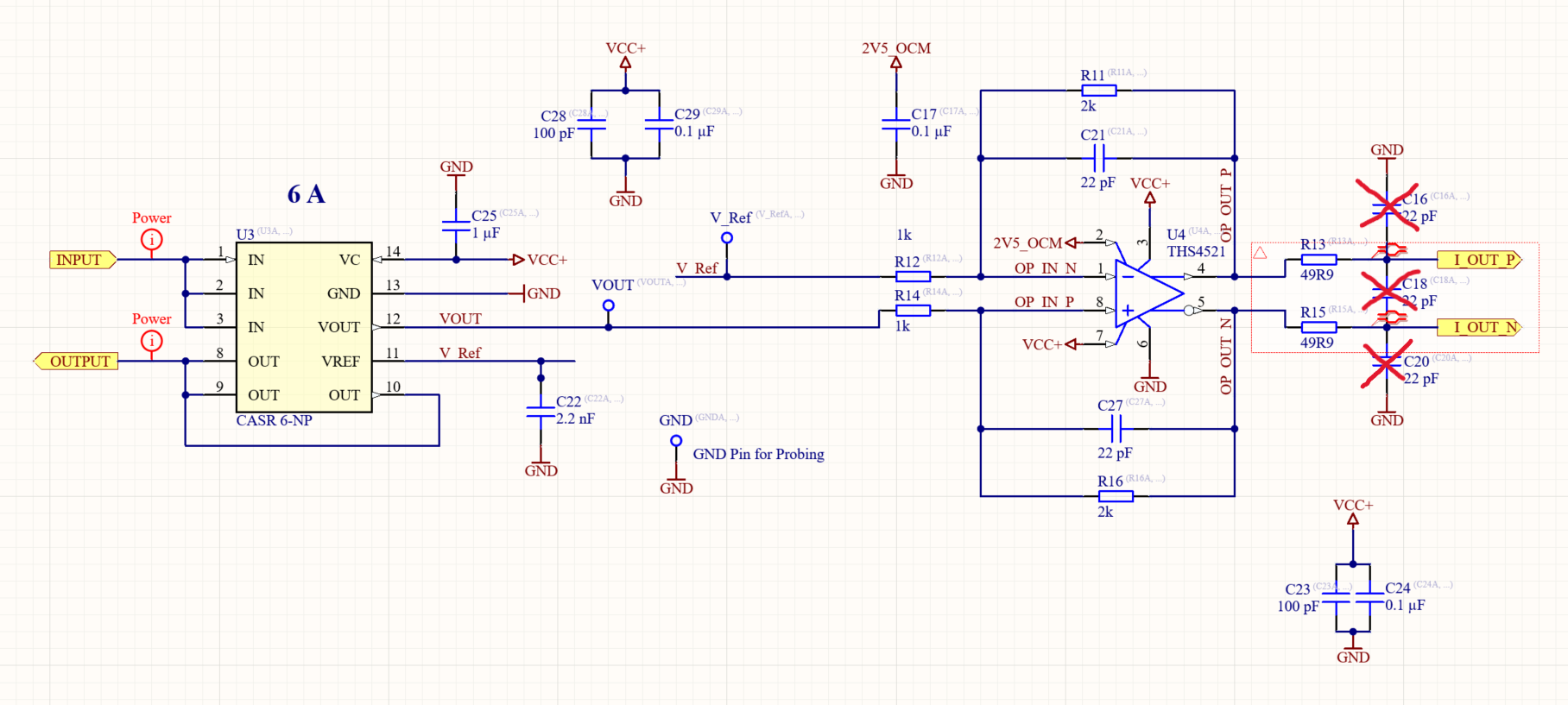 The THS4521 op-amp has output swing limitations and cannot reach the exact power supply rails. According to its datasheet, at a 5.0 V supply, the output typically swings between ~0.1 V and ~4.7 V. So the linear output swing is around 0.1 V to 4.7 V. When using high-range sensors (CAS5015SRA-LI, CAS5025SRA-LI etc.), the amplified signal pushes the op-amp very close to these swing limits. Using a slightly elevated VCC+ (5.12 V) improves the available headroom. Therefore: