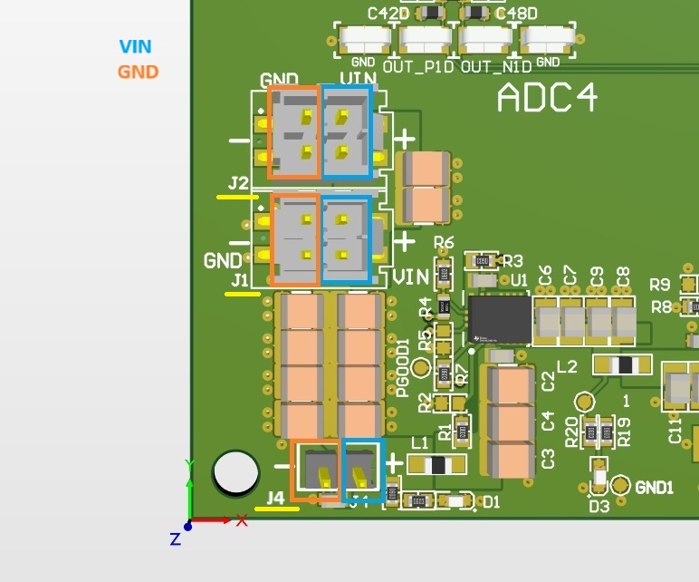 J1,J2: VIN/GND from the Analog LTC2311-16 card with a manufactured power supply cable (Type
