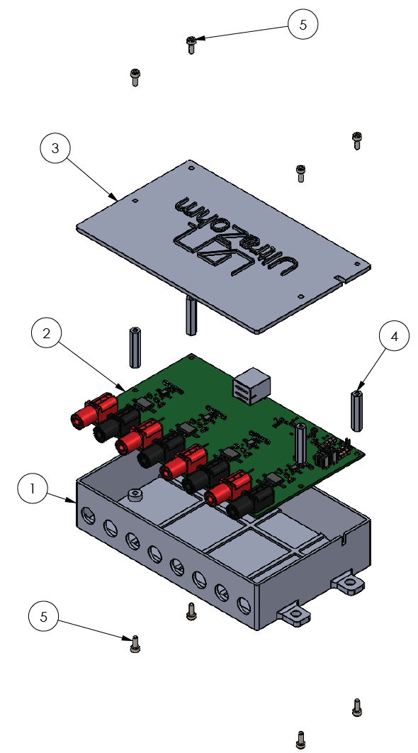 A 3D-printable housing is available for the voltage measurement PCB. The assembly with all necessary parts, including a bill of materials (BOM), is shown below. The PCB can be used without the housing, but the setup is more rugged and clean with the housing.