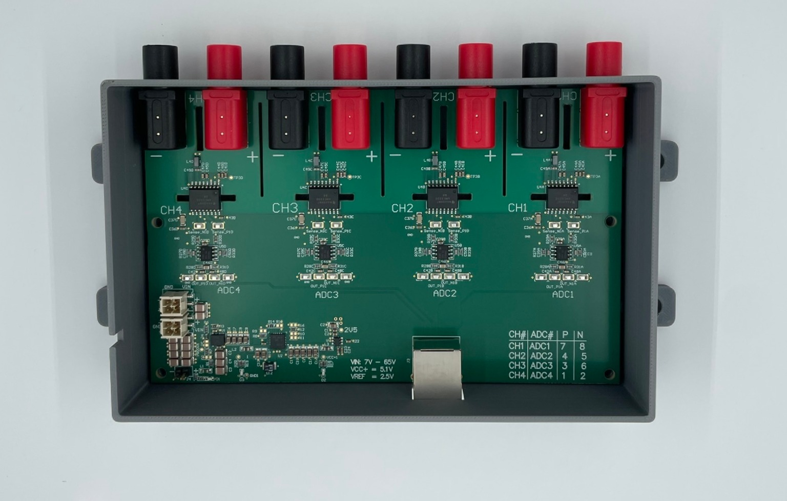 4mm jack connectors for voltage measurement. V+ and V- for each channel.