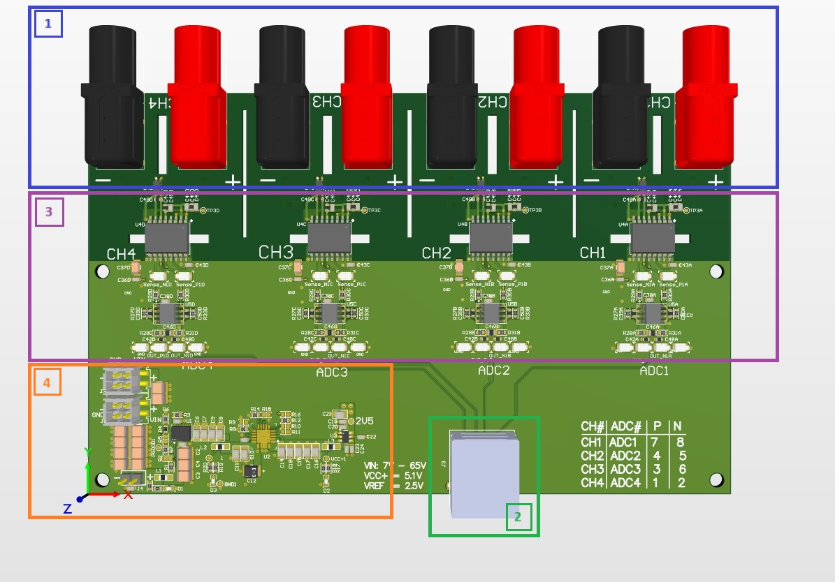 MMSD-02-xx-x-xx.xx-x-x) or J4 (TSW-102-07-F-S).Voltage dividers for up to 1000V measurement range.