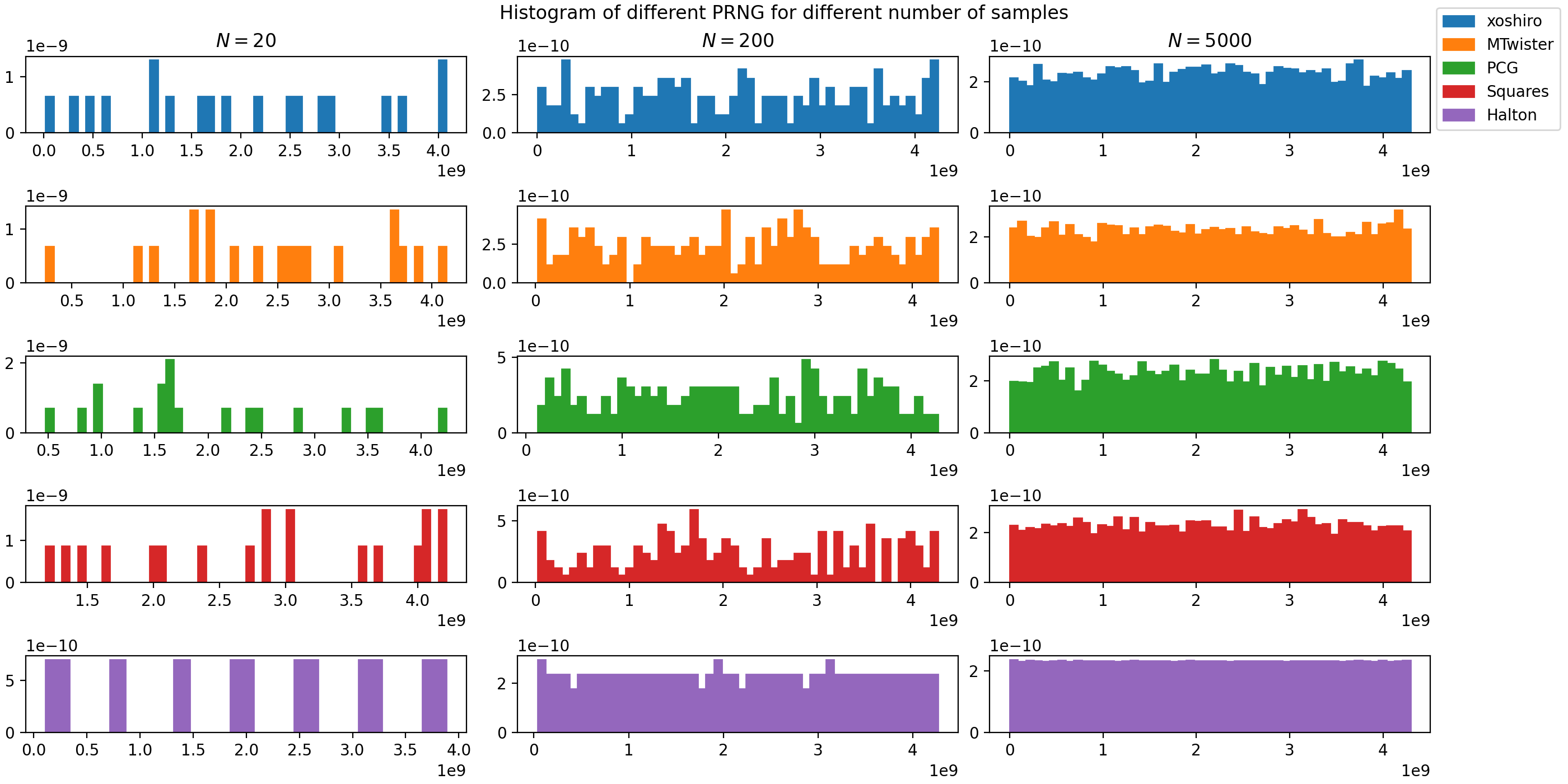 The following figure compares the distributions of the different implemented PRNGs by showing the generated numbers’ histogram after different sample sizes are drawn. The distributions of the generated numbers tend towards a uniform distribution for an increasing number of samples.