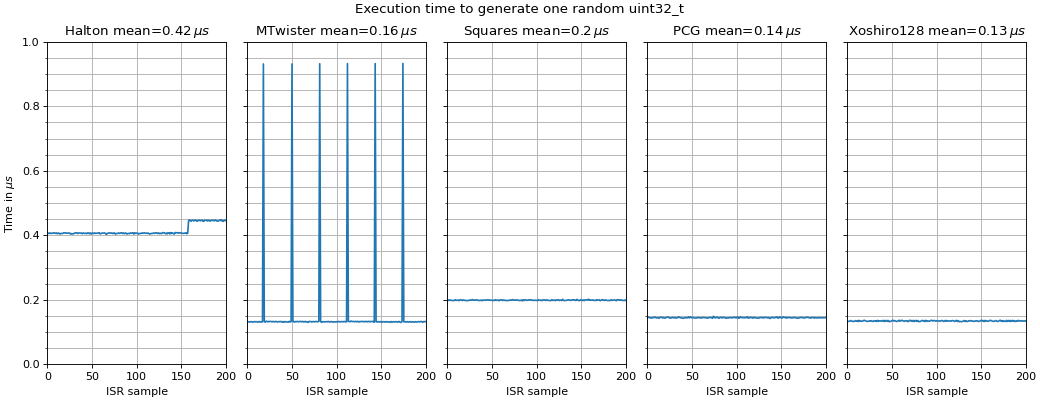 uz_prng_generator_xoshiroanduz_prng_generator_pcgare the fastest generatorsuz_prng_generator_mtwisterhas a low mean calculation time. However, the internal state is shuffled every 620 calls, resulting in a spike in calculation time. This shuffle of the state is inherent to the algorithm. Thus,uz_prng_generator_mtwisteris not recommended for usage in the ISR.uz_prng_generator_haltonseems to increase calculation time with the number of samples taken and approaches \(0.6\,\mu s\) per random number, see Halton timing.