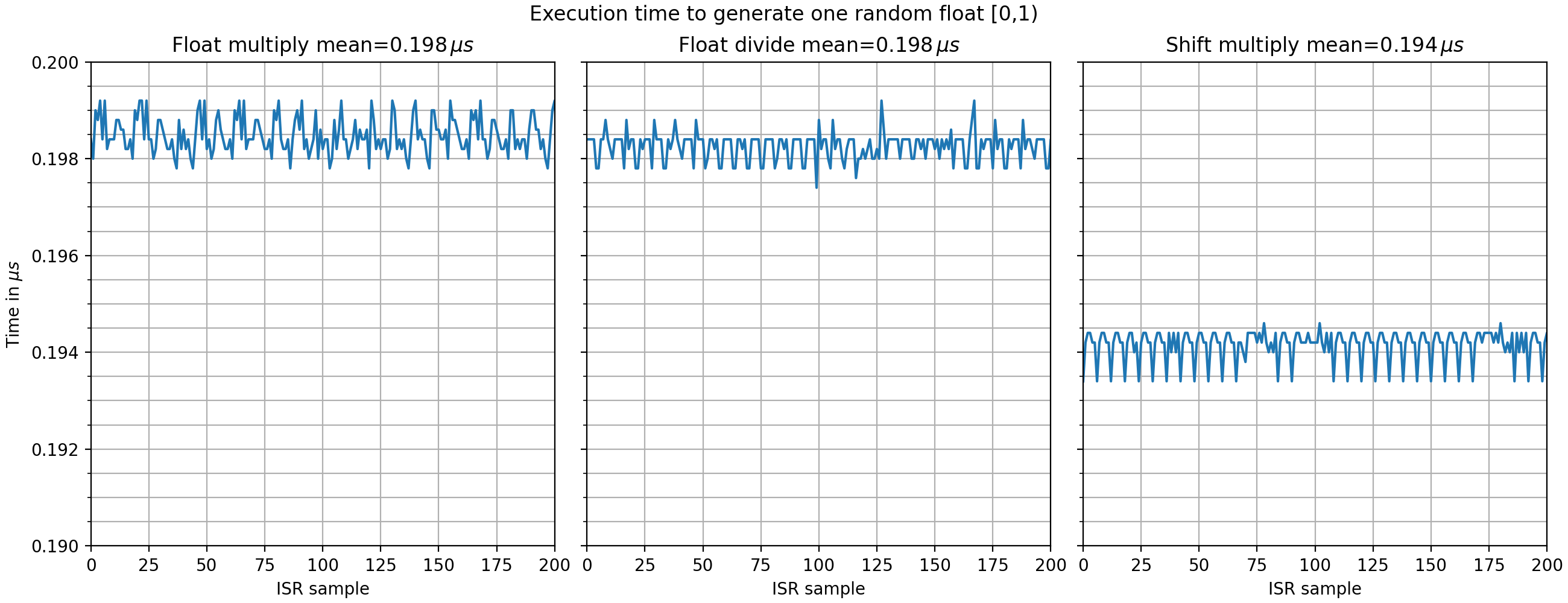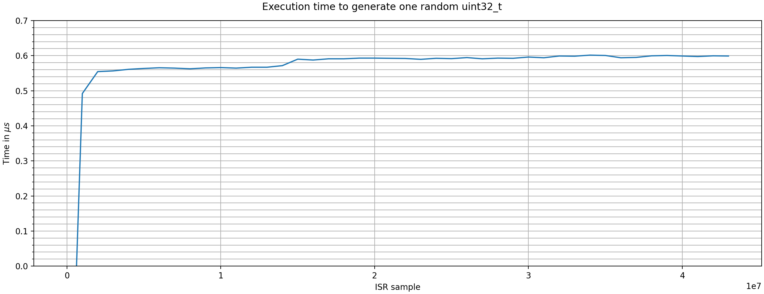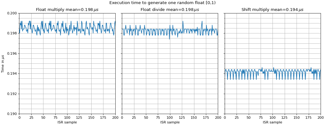 The measurement is based on generating 20 values per ISR over 4000 ISR cycles by calling uz_prng_get_uniform_uint32_zero_to_uint32_max.