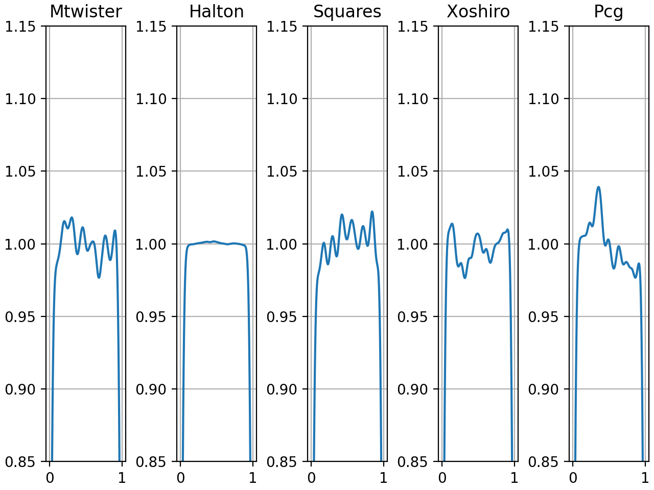 Fig. 355 Density distribution of each generator calculated using Matlab ksdensity for 10 random seeds each. Values generated by uz_prng_get_uniform_float_zero_to_one using uz_prng_float_scale_fp_multiply.#