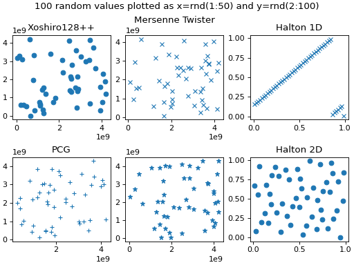 Fig. 351 Generated random values generated with uz_prng_get_uniform_uint32_zero_to_uint32_max using different generators plotted as 2-dimensional data. Using uz_prng_generator_halton does not yield a random pattern but a linear relationship between the generated values. Using uz_prng_halton_get_uniform_float_2d generates a proper Halton sequence for 2 dimensions.#