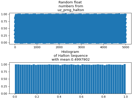 Implements a Halton sequence [[1]], [[2]] which is a low discrepancy sequence [[3]]. A Halton sequence is not a pseudo-random number generator such as Mersenne Twister but a quasi-random sequence. Thus, the output of the Halton sequence appears random and typically the distribution of the generated numbers is more even compared to PRNGs. Care has to be taken regarding multi-dimensional Halton sequence, see 2D Case. Specifically, one must not use a one-dimensional sequence for multi-dimensional applications since the distribution properties do not hold in this case.
