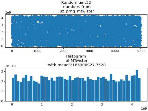 The following figures shows the generation of 5000 random numbers using the Mersenne Twister. Additionally, the Histogram of the generated values is shown. The generated random values are uniformly distributed, but not in a perfect manner. The specific pattern and distribution depends on the random seed.